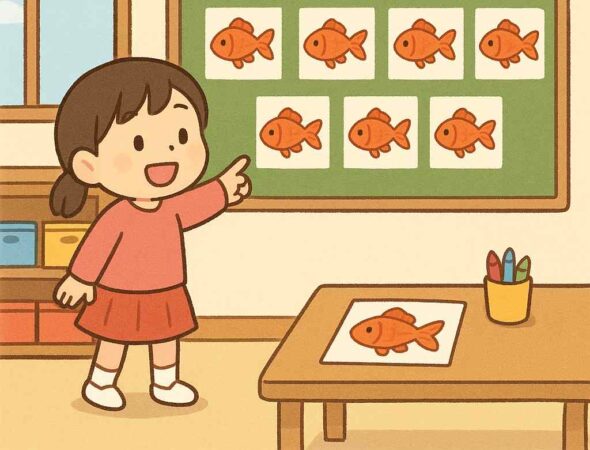 読んだあとは、教室内に金魚のシールや画用紙を貼って「きんぎょ探しゲーム」を。