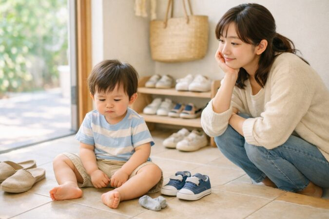「靴、履いてね!」といざ言っても、1歳児にはまだ「履かされている感」が強い。必死に履かせようとすると、嫌がってギャン泣き。履かせてあげたいけど、まるで「もうちょっとだけ我慢して!」と心の中でお祈りしている気持ちに。