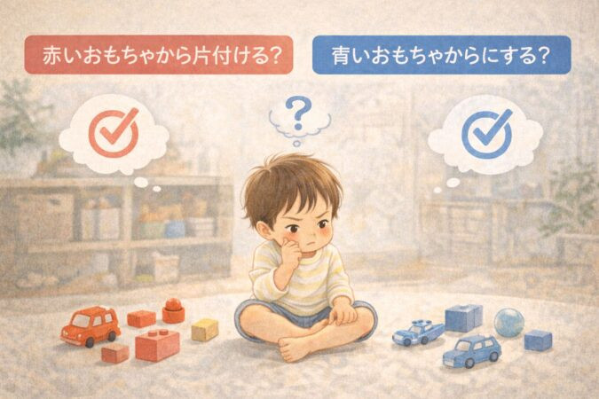 「お片付けして!」ではなく、「赤いおもちゃから片付ける? 青いおもちゃからにする?」。 自分で選ばせることで、「命令された」という感覚が「自分で決めた」という満足感に変わります。主導権を少しだけ子どもに渡すのがポイントです。