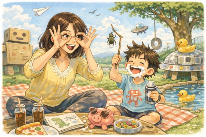 今回お伝えしたいのは、遊びのバリエーションではなく、親の「視点のずらし方」です。 小学生の子どもは、学校という「評価される場」で常に緊張しています。だからこそ、家では「何の役にも立たないこと」を面白がってくれる大人の存在が、究極の安心感(余白)になるんです。
