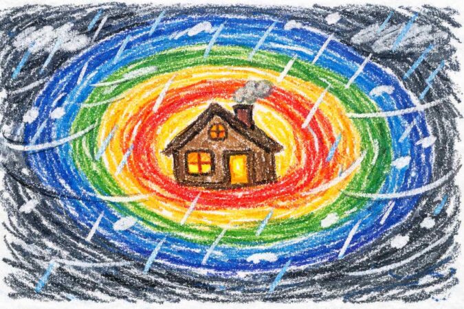 【作品の様子】 画面の中央に家があり、その周りがぐるりと何重もの線や虹のような模様で囲まれています。家の窓は小さく、でも中は暖かそうなオレンジ色で塗られており、外側には激しい雨や風を思わせる描写があることも。