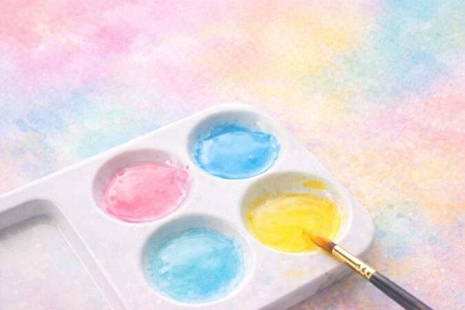 2. 淡いピンク × 水色 × 黄色(パステルカラーの重ね塗り)