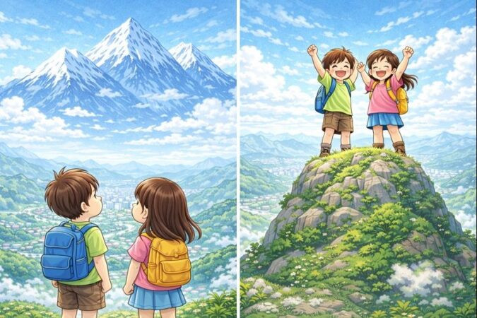 | 高い山=親からのプレッシャー? | 子どもは高さを「圧迫感」とは捉えません。むしろ「カッコいい!」「登ったらすごそう!」という憧れです。 |